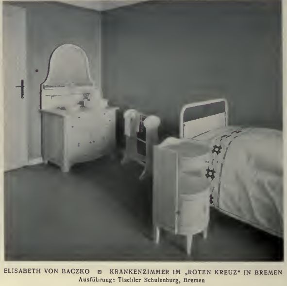 Schaefer, Karl: Neue Arbeiten von E. von Baczko.Bildquelle Damenzimmer und Krankenzimmer in: Kunstgewerbeblatt. NF 20, E.A. Seemann, Leipzig 1909, S. 201–204,http://digi.ub.uni-heidelberg.de/diglit/kunstgewerbeblatt1909/0208