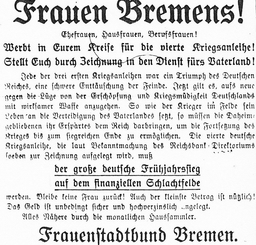 "Unsere Männer und Söhne kämpfen draußen auf dem Felde und auf dem Meere Schulter an Schulter. Wir Frauen wollen das Gleiche in der Heimat tun", hieß es in einem Aufruf des Zentralen Hilfsausschusses vom Roten Kreuz(ZHA) in Bremen.