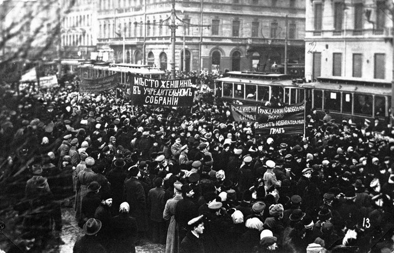 streiken Arbeiterinnen und fordern andere auf, sich anzuschließen. Am 12. März mündet diese Unzufriedenheit in einen Aufstand - die Febru-arrevolution.