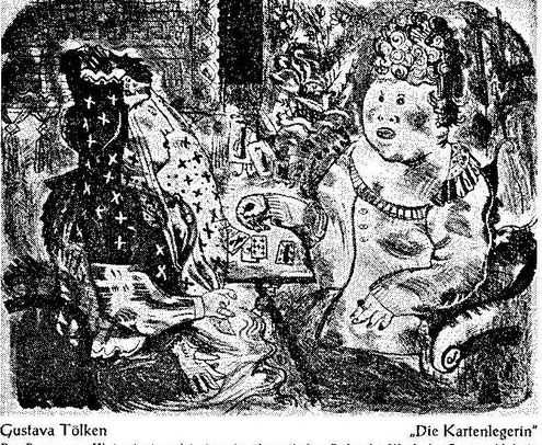 Witz, Phantasie, Skurrilität, die der 84jährigen Gustava Tölken wie in nachstehenden Versen aus der Feder flossen, zeigen sich ebenso in den Bildern der Malerin und Schriftstellerin. Ihre Bilder, meist undatiert und unsigniert, führen in eine Welt der Träume, der Phantasie, des Grotesken, des Unbewußten, in eine Zwischenwelt, in der Realität, Zeitgeschehen und Traum zueinander finden.