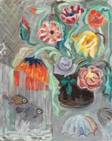 Stillleben mit Blumenstrauß und Zierfischen