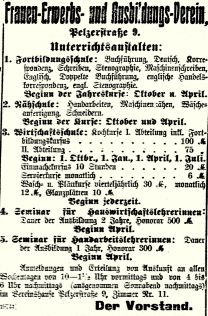 |  | Frauen- Erwerbs- und Ausbildungsverein Der FEV hatte bei Kriegsbeginn über 20 Abteilungen, davon vier Schulen und fünf gemeinnützige Einrichtungen. Vom Roten Kreuz  wurden im Haus des FEV in der Pelzerstraße eine Kleiderkammer und eine  Nähstube eingerichtet, in der Kleidungsstücke geändert und für einen geringen Preis verkauft wurden.