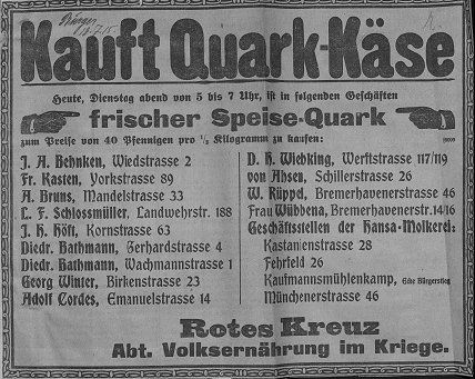 Schon in den ersten Tagen kam es auch in Bremen  zu Panikkäufen. Das führte sofort zu Preiserhöhungen. "Lebensmittelwucher ist verabscheuungswürdiger als Geldwucher, zumal in Kriegszeiten", schalt der Konsumverein "Vorwärts". Obwohl die Lebensmittelkommission  Höchstpreise für Grundnahrungsmittel festsetzte, erhöhten sich die Lebensmittelkosten zwischen 1914 und 1918 dennoch um das Dreifache Regulierung der Verteilung der immer knapper werdenden Waren wurden ab August 1915 Lebensmittelmarken eingeführt..